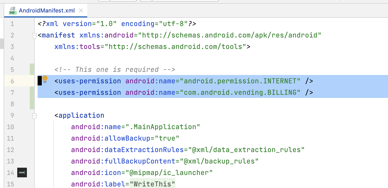 <uses-permission android:name="com.android.vending.BILLING" />Then add our Activity to your AndroidManifest.xml: